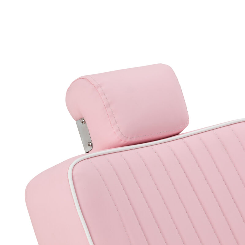 Solidna konstrukcja podstawy zapewnia stabilność oraz wysoki komfort użytkowania. Siedzisko wypełnione odporną na odkształcenia pianką oraz obite miękką, matową skórą syntetyczną łączy trwałość z komfortem. Materiały użyte do wykończenia są odporne na wilgoć, wytrzymałe i łatwe w czyszczeniu, co sprawia, że fotel doskonale sprawdza się w codziennej pracy. Stylowe przeszycia i tapicerka w odcieniach różu nadają mu wyjątkowego charakteru, idealnie komponującego się z wystrojem nowoczesnych salonów barberskich.
