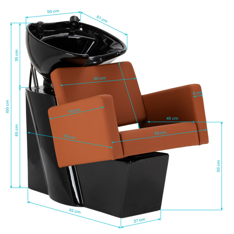 Fotel o geometrycznej formie łączy nowoczesną prostotę z wygodą użytkowania. Siedzisko i podłokietniki o łagodnych kątach tworzą harmonijną całość, zapewniając komfortową pozycję podczas zabiegów, a oparcie o optymalnym kącie nachylenia wspiera prawidłową postawę i odprężenie. Tapicerka z wysokiej jakości skóry syntetycznej w odcieniach brązu jest odporna na zużycie i wilgoć, a przy tym łatwa do utrzymania w czystości. Prosta, nowoczesna forma mebla podkreśla elegancki charakter myjni, a kompletna armatura – bateria, słuchawka prysznicowa i dedykowane węże – zapewnia pełny zestaw narzędzi do pracy.