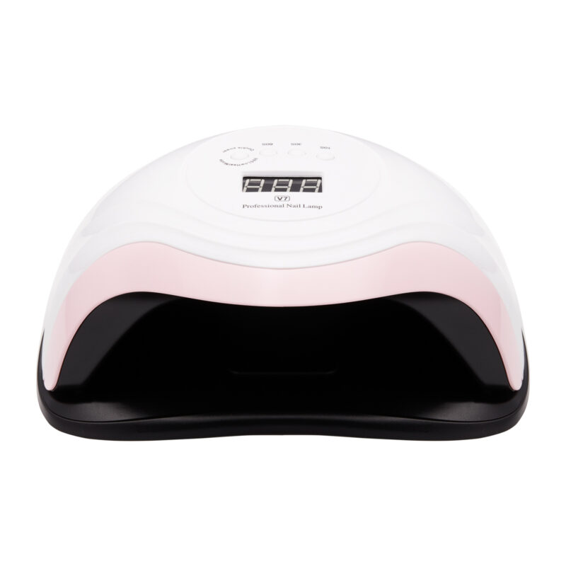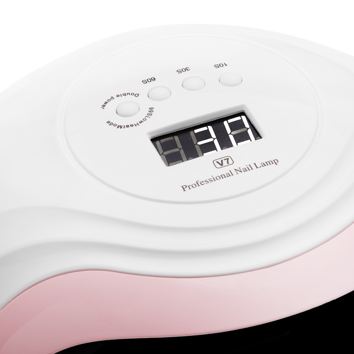 Najnowszej generacji, profesjonalna lampa UV/LED, która szybko i równomiernie utwardza wszystkie żele, lakiery hybrydowe i inne preparaty światłoutwardzalne dzięki zastosowaniu technologii dual led. Emituje białe światło, które nie męczy wzroku. Lampa V7 posiada energooszczędne źródło światła o dużej mocy i podwójnym zakresie fal 365nm i 405nm. Ponadto, 36 diód które dają łączną moc maksymalną o wartości 168W! Lampa posiada wbudowany sensor ruchu, timer 10, 30, 60 i 99 sekund, a po uruchomieniu sensora świeci nieprzerwanie do 99 sekund. Tryb 99 sekund „Low Heat Mode” to tryb, w którym moc lampy stopniowo wzrasta co 30 sekund. Niweluje on uczucie pieczenia podczas aplikacji żeli budujących. Duży elektroniczny wyświetlacz ułatwia kontrolę czasu.