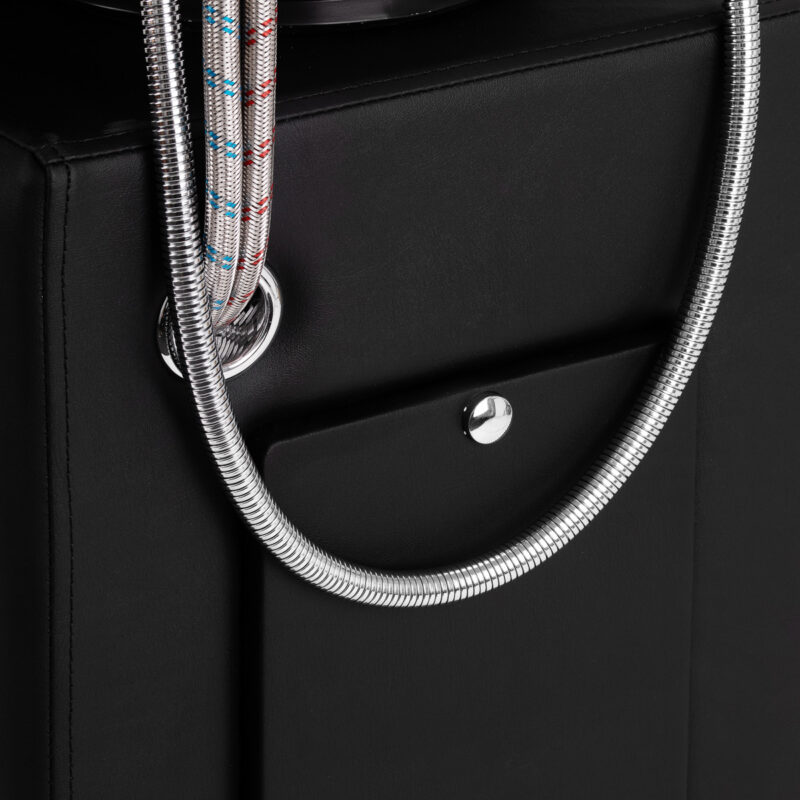Myjnia została wyposażona w baterię z mieszaczem, zapewniającą stały dostęp do ciepłej i zimnej wody oraz możliwość precyzyjnego dopasowania temperatury do potrzeb i preferencji klienta. Praktyczne miejsce na odłożenie słuchawki natryskowej usprawnia codzienną pracę, a korek z wbudowanym sitkiem umożliwia kontrolę przepływu wody oraz pomaga utrzymać wysoki poziom higieny w salonie. Przyłącze wody umieszczone wewnątrz podstawy pozwala na estetyczne ukrycie instalacji. Odpowiednio wyprofilowany fotel gwarantuje komfort podczas wykonywania różnorodnych zabiegów, a połączenie funkcjonalnych rozwiązań i praktycznych udogodnień przekłada się na jeszcze większą wygodę pracy w salonie fryzjerskim.