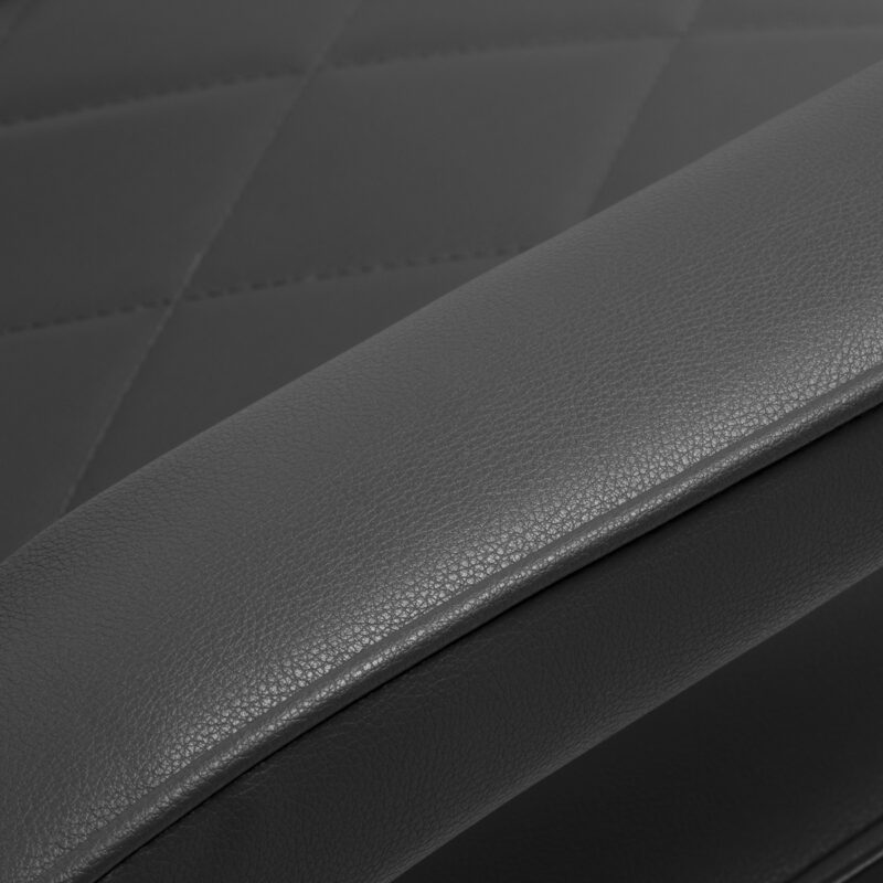 Solidna konstrukcja okrągłej podstawy zapewnia stabilność oraz wysoki komfort użytkowania. Wypełnienie siedziska z odpornej na odkształcenia pianki oraz obicie wykonane z przyjemnej w dotyku skóry syntetycznej o matowym wykończeniu zapewniają trwałość mebla oraz jego komfortowe użytkowanie przez długi czas. Stylowe przeszycia na tapicerce nadają fotelowi charakteru, przywodząc na myśl design motoryzacyjny, co podkreśla jego elegancki wygląd. Sprawiają również, że sprzęt jest odporny na wilgoć, wytrzymały oraz łatwy do czyszczenia. Pokrycie w odcieniach szarości nadaje mu wyjątkowego charakteru, a minimalistyczny styl pozwala mu wpasować się w wystrój każdego salonu barberskiego.