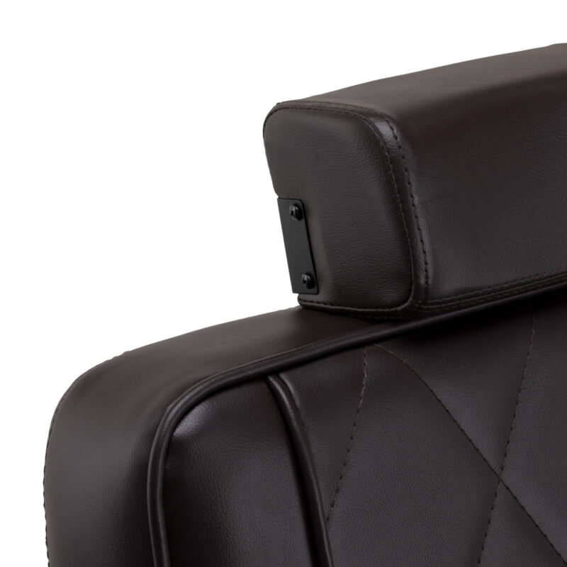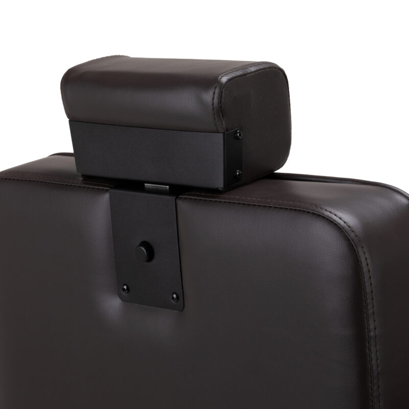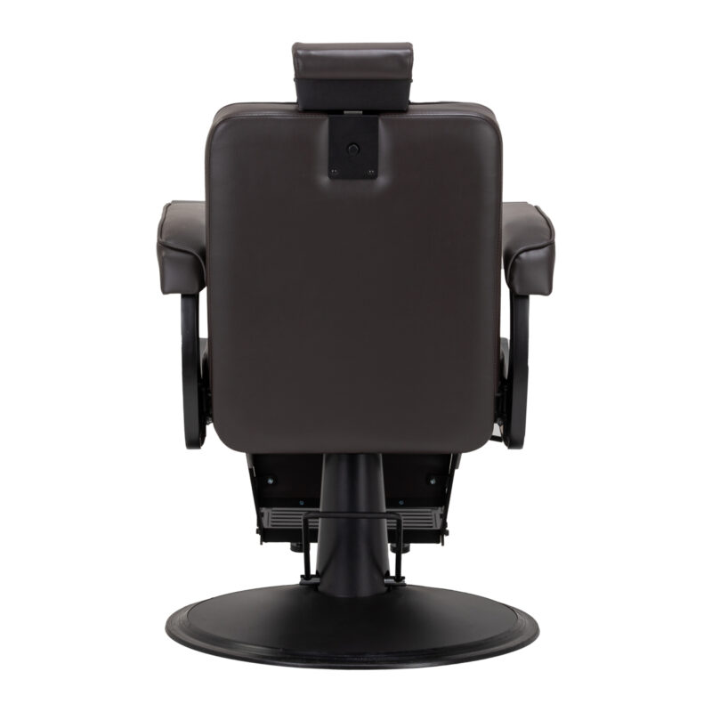 Solidna konstrukcja okrągłej podstawy zapewnia stabilność oraz wysoki komfort użytkowania. Wypełnienie siedziska z odpornej na odkształcenia pianki oraz obicie wykonane z przyjemnej w dotyku skóry syntetycznej o matowym wykończeniu zapewniają trwałość mebla oraz jego komfortowe użytkowanie przez długi czas. Stylowe przeszycia na tapicerce nadają fotelowi charakteru, przywodząc na myśl design motoryzacyjny, co podkreśla jego elegancki wygląd. Sprawiają również, że sprzęt jest odporny na wilgoć, wytrzymały oraz łatwy do czyszczenia. Pokrycie w odcieniach brązu nadaje mu wyjątkowego charakteru, a minimalistyczny styl pozwala mu wpasować się w wystrój każdego salonu barberskiego.