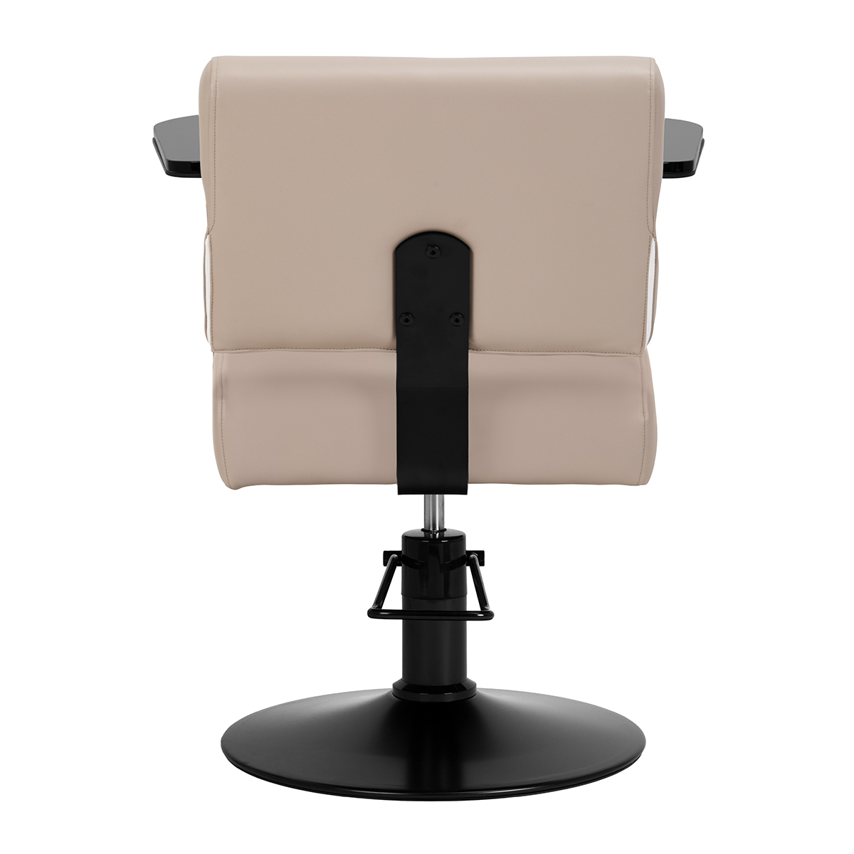 Wydajny hydrauliczny podnośnik umożliwia precyzyjne dopasowanie wysokości siedziska w zakresie 49-58 cm, co pozwala na wygodne ustawienie fotela i zapewnia ergonomiczną pracę. Profilowane oparcie zapewnia odpowiednie podparcie pleców, sprzyjając wygodnej pozycji nawet podczas dłuższych wizyt w salonie. Przestrzeń pomiędzy siedziskiem a oparciem ułatwia utrzymanie czystości stanowiska pracy, umożliwiając szybkie i dokładne usunięcie włosów.