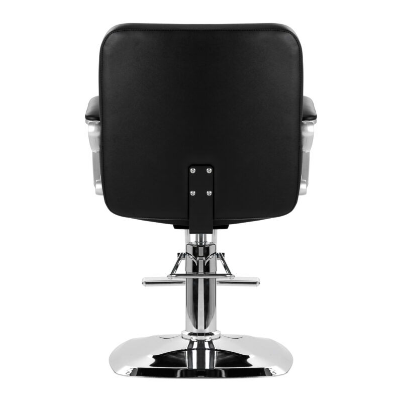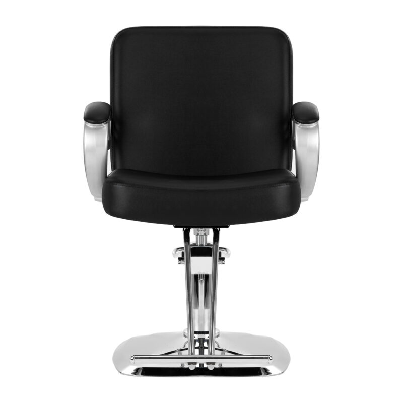 Solidna podstawa zapewnia stabilność w trakcie użytkowania, a jej powierzchnia o lustrzanym wykończeniu jest łatwa do utrzymania w czystości. Wygodne siedzisko wypełnione zostało trwałą pianką, by zapewniać wysoki komfort użytkowania, nawet podczas wielogodzinnych zabiegów. Częściowo tapicerowane podłokietniki są ciekawym wizualnie elementem, a dzięki odpowiedniemu wyprofilowaniu pozwalają na prawidłowe ułożenie barków klienta. Dzięki temu nie chowa on głowy w ramionach ani się nie garbi – co wyraźnie ułatwia wykonywanie precyzyjnych zabiegów, w tym strzyżenia. Wyposażenie fotela w mechanizm pełnego obrotu sprawia, że praca fryzjera staje się bardziej efektywna oraz wygodna.