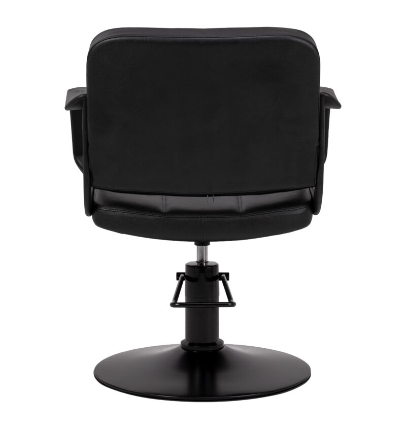 Elegancka forma łączy nowoczesny styl z trwałością oraz stabilną konstrukcją, tworząc estetyczne i funkcjonalne wyposażenie salonu fryzjerskiego. Obicie z czarnej skóry syntetycznej wyróżnia się odpornością na wilgoć oraz łatwością utrzymania w czystości, co przekłada się na długotrwałe, komfortowe użytkowanie. Okrągła podstawa zapewnia stabilność i wytrzymałość podczas codziennej pracy, a starannie wykonane detale podkreślają jakość modelu. Uniwersalna, minimalistyczna kolorystyka w połączeniu z dekoracyjnymi przeszyciami sprawia, że fotel świetnie wpisuje się w różnorodne aranżacje salonów, dodając wnętrzu eleganckiego charakteru.