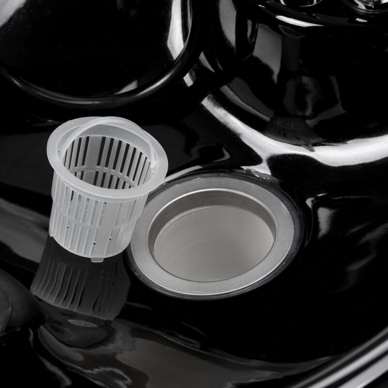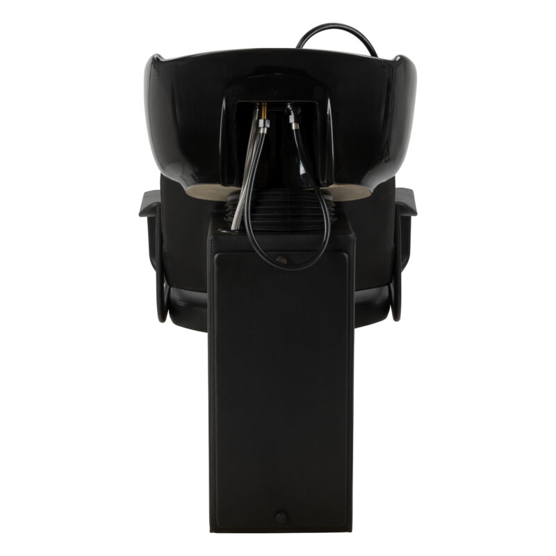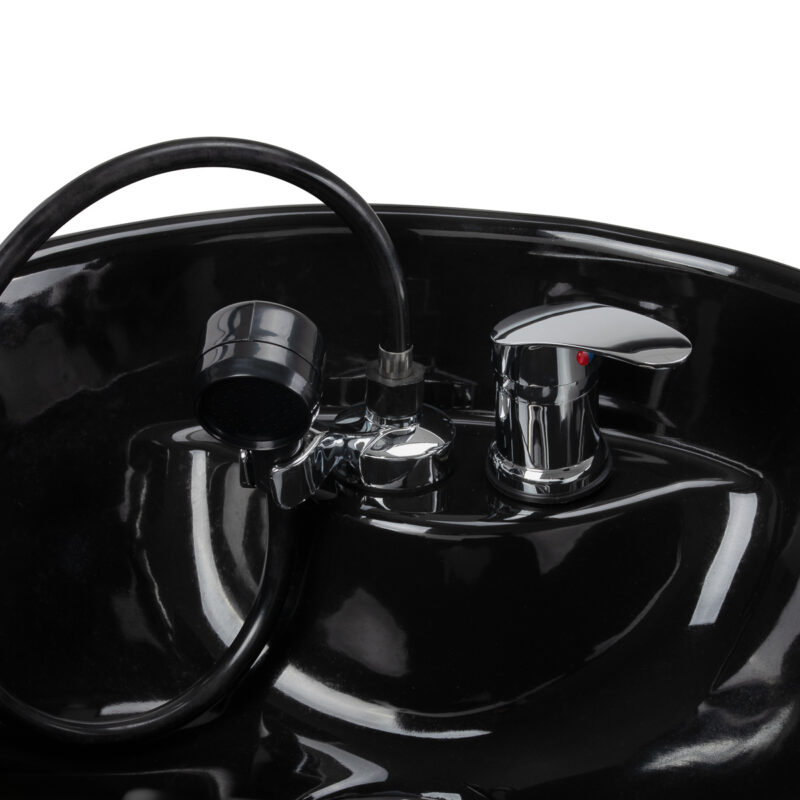 Model wyposażono w baterię z mieszaczem, zapewniającą stały dostęp do ciepłej i zimnej wody oraz wygodne dopasowanie temperatury do potrzeb klienta. Miejsce na odłożenie słuchawki natryskowej usprawnia organizację pracy, a korek z wbudowanym sitkiem pozwala kontrolować przepływ wody i wspiera utrzymanie higieny stanowiska. Przyłącze wody ukryte wewnątrz podstawy umożliwia estetyczne zamaskowanie instalacji, podkreślając schludny i profesjonalny wygląd myjni. Funkcjonalne rozwiązania przekładają się na sprawną i komfortową codzienną pracę w salonie.