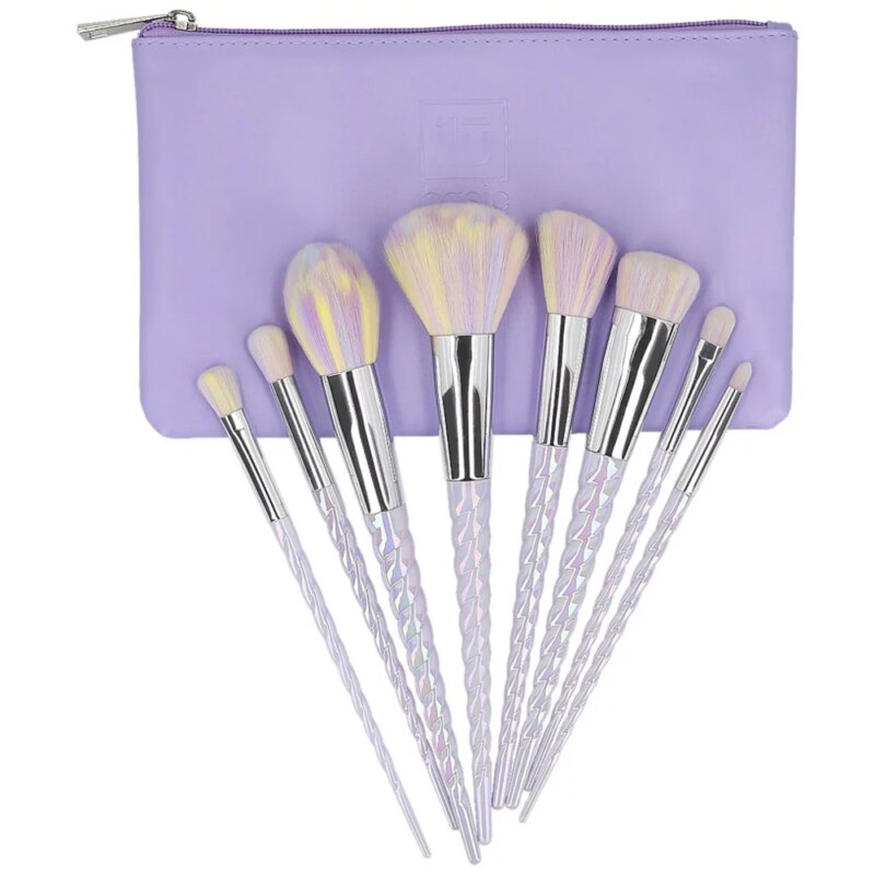 Ten zestaw pędzli do makijażu zawiera 8 podstawowych pędzli, za pomocą których wykonasz codzienny makijaż. Pędzle są wyposażone w pastelowe, wegańskie włosie, srebrne skuwki oraz rączki w kształcie rogu jednorożca. Do zestawu dołączona jest praktyczna kosmetyczka z wegańskiego materiału idealna do przechowywania pędzli w domu, jak i zabrania ich w podróż.