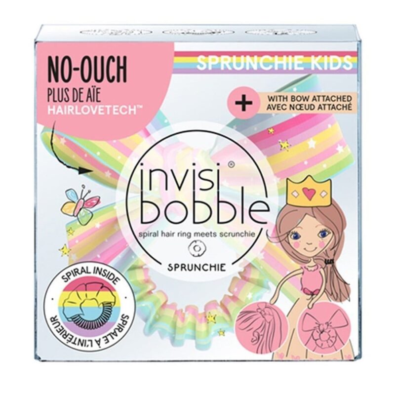 Invisibobble SPRUNCHIE, ikona stylu. Dzięki HAIRLOVETECH, posiadającej spiralę wewnątrz, SPRUNCHIE zapewniają maksymalne utrwalenie, a jednocześnie są delikatne dla włosów. Do wszystkich rodzajów włosów i wszystkich stylów. Wersja KIDS posiada uroczą kokardę i piękny wzór z tęczą i słodyczami. Najlepszy sposób, aby zamienić każdy dzień w dzień zabawy!