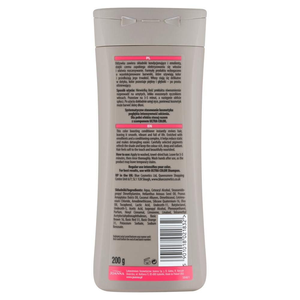 Odżywka Joanna Ultra Color najlepiej sprawdza się przy włosach w odcieniach czerwieni i wiśni. Wyselekcjonowane barwniki pomagają ożywić kolor i podkreślić jego wyrazistość, dzięki czemu włosy prezentują się świeżo i intensywnie. Systematyczne stosowanie może pogłębiać intensywność odcienia.