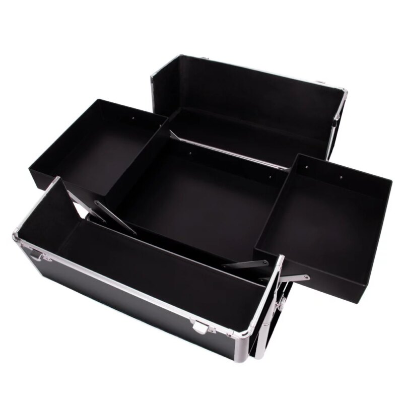 Funkcjonalny i atrakcyjny kuferek kosmetyczny/fryzjerski idealny dla stylistek paznokci, kosmetyczek, wizażystek pracujących w terenie lub do przechowywania kosmetyków w domu. Solidne wykonany, rozkładany oraz optymalnie dobrany rozmiar kuferka pozwala na bezproblemowe włożenie do środka pełnowymiarowej lampy UV oraz LED.