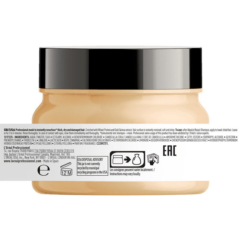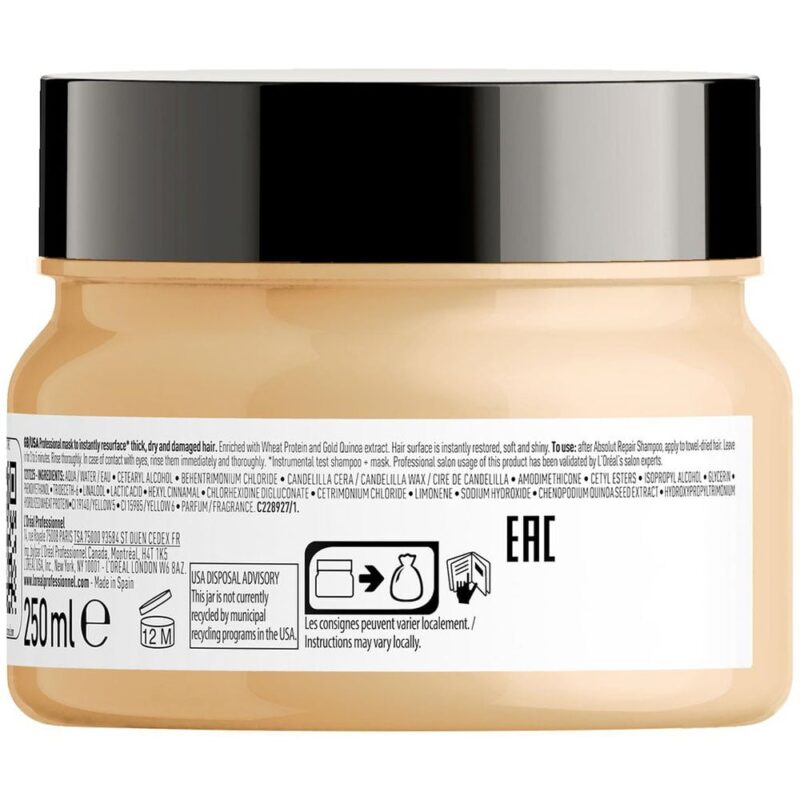Maska Loreal Absolut Repair Gold to bogata w składniki odbudowujące maska, która zniszczone, osłabione włosy zamienia w silne i lśniące pasma. Zawiera komosę ryżową, nazywaną „świętym zbożem Inków”. Jest ona bogactwem protein i aminokwasów, które wspaniale regenerują pasma, nawilżają je i chronią przed kolejnymi uszkodzeniami. Ogranicza łamliwość włosów i rozdwajanie się końcówek. Włókno włosa staje się gładkie i błyszczące. Maska ułatwia rozczesywanie włosów. Kremowo-żelowa konsystencja łatwo rozprowadza się na włosach i nie obciąża pasm.