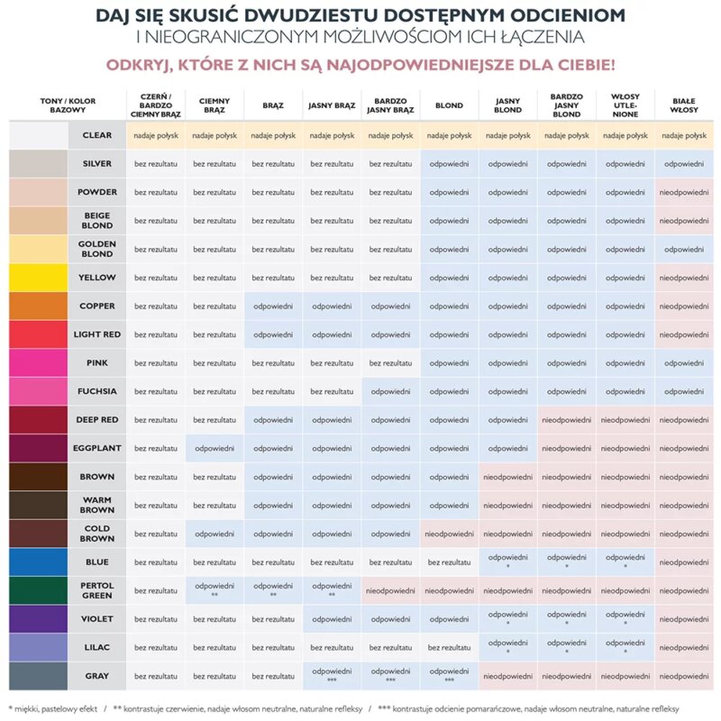 Profesjonalna, innowacyjna i delikatna Odżywka koloryzująca Milk Shake Direct Colour Powder służy do tymczasowej koloryzacji włosów i ich tonowania. Produkt nie zawiera amoniaku, oksydantu i utleniacza. Nie niszczy i nie wysusza włosów, a także nie narusza ich struktury. Intensywny pigment odżywki zapewnia doskonały kolor, pozostawiając włosy zdrowe i pełne blasku. Odżywka pokrywa pierwsze siwe włosy, tymczasowo je tonując. Aktywne składniki takie jak masło Shea, białka mleka czy olej arganowy tworzą idealną miksturę, która regeneruje i nawilża włosy. Kompleks antyoksydacyjny Integrity 41 odpowiedzialny za stabilność koloru chroni włosy przed wolnymi rodnikami i szkodliwym działaniem czynników zewnętrznych, gwarantuje długotrwały efekt. Produkt dostępny jest w 20 różnych odcieniach.