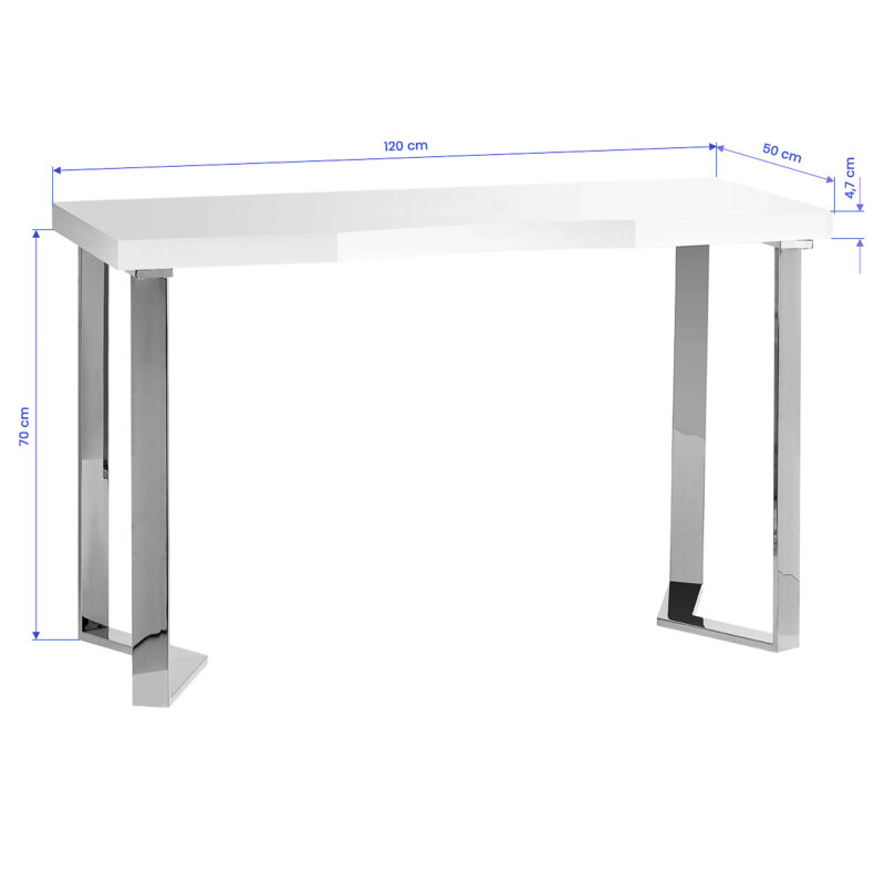 Biurko kosmetyczne Momo 05 łączy prostotę i styl z myślą o profesjonalnych salonach. Minimalistyczny design ze srebrnymi elementami nadaje mu elegancki charakter, a gładki blat na wysoki połysk zapewnia komfort pracy i łatwe utrzymanie czystości podczas codziennych zabiegów.