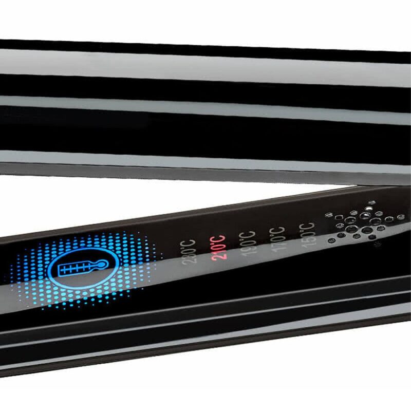Prostownica posiada elektroniczny system kontroli temperatury ze sterowaniem dotykowym. Przycisk zasilania jest mechaniczny i jest umieszczony na krawędzi urządzenia i nieco „wpuszczony”. Ale regulacja temperatury odbywa się za pomocą specjalnych czujników ze wskaźnikami LED, które znajdują się wewnątrz modelu. W sumie model zapewnia 5 trybów wyboru temperatury nagrzewania płyt – 150 – 170 – 190 – 210 – 230 C. Dzięki temu możesz używać żelazka z każdym rodzajem włosów. Zwracamy również uwagę na obecność systemu podwójnego napięcia, który pozwoli na zastosowanie prostownika w dowolnym kraju na świecie.