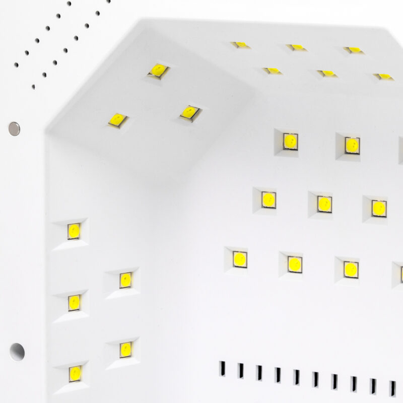 Dzięki 36 precyzyjnie rozmieszczonym diodom LED, lampa zapewnia perfekcyjne utwardzenie żeli i lakierów hybrydowych, eliminując martwe strefy. Jej zamknięta konstrukcja, tzw. budka, pozwala na jeszcze szybsze i bardziej precyzyjne utrwalanie stylizacji. Technologia Dual LED, która emituje światło o dwóch długościach fali, redukuje zmęczenie oczu i rozszerza zakres działania urządzenia. Lustrzane dno równomiernie rozprasza światło, przyspieszając proces utwardzania. Dzięki tym zaawansowanym funkcjom lampa umożliwia perfekcyjne utwardzenie nawet najbardziej wymagających produktów, docierając do trudno dostępnych miejsc na płytce paznokcia.