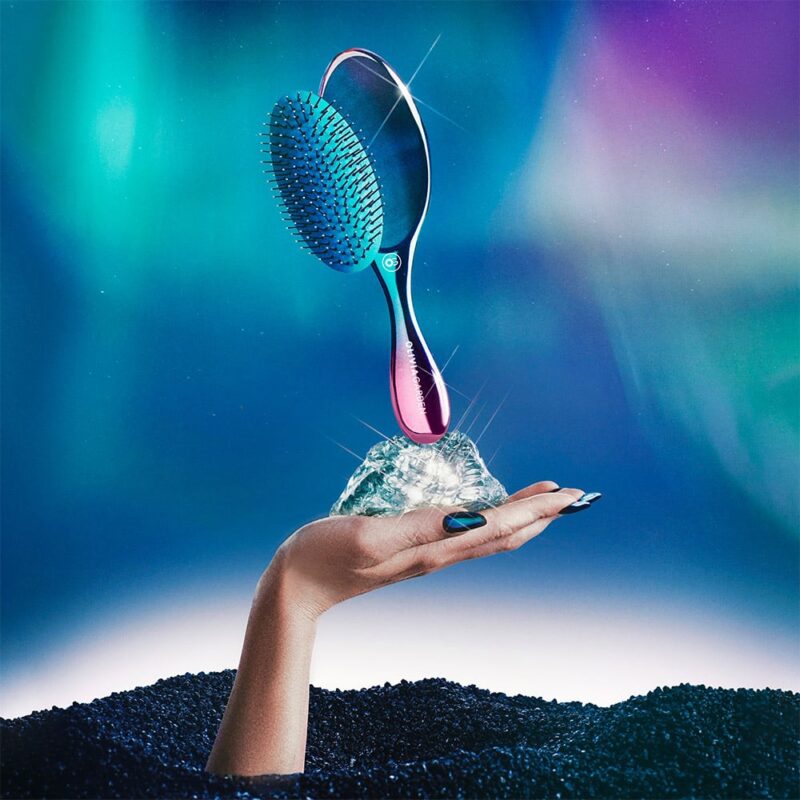 Kolekcja barwnych szczotek Aurora zaprasza w podróż po świetlistych inspiracjach zorzą polarną. Przyciąga wzrok metalicznym wykończeniem przechodzących przez siebie barw. Aurora Blue została stworzona z myślą o łatwości rozczesywania włosów normalnych i grubych.
