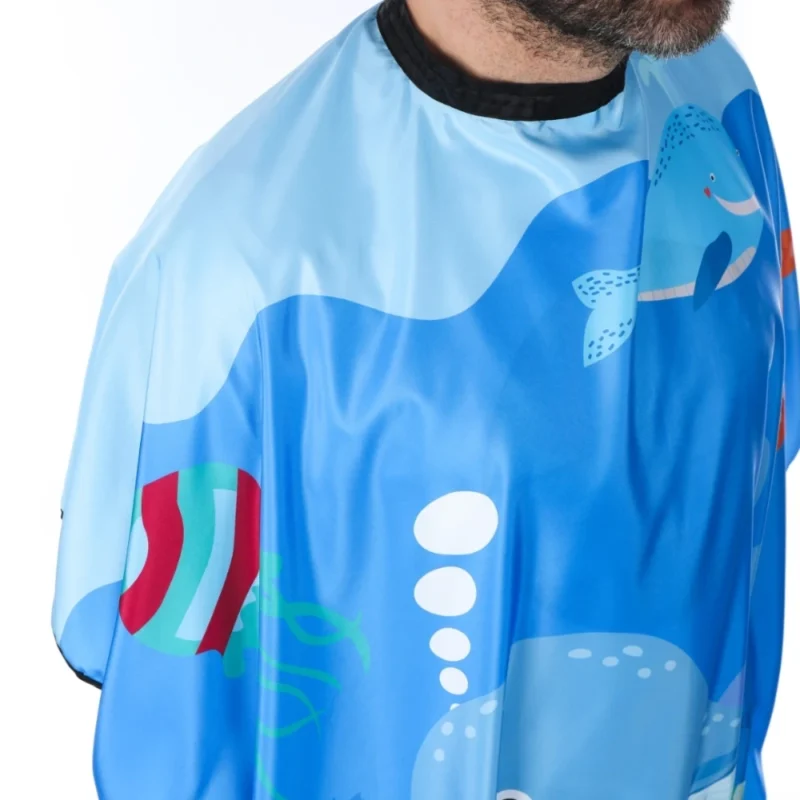 Zamień wizytę u fryzjera w kolorową podróż pod fale oceanu. Ta wodoodporna peleryna o wymiarach 135×100 cm otuli każdego małego odkrywcę, chroniąc ubranie przed włoskami i wodą.