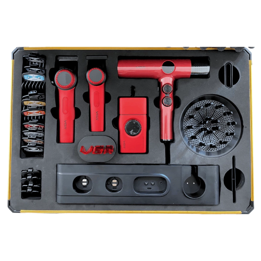 VGR Stepless Pro 4w1 – maszynka, trymer, golarka i suszarka fryzjerska + stacja ładująca w eleganckiej walizce