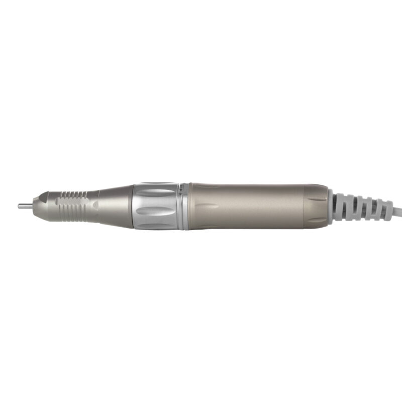Frezarka wyróżnia się minimalistycznym wyglądem, doskonale wpisując się w estetykę nowoczesnych salonów beauty. Smukła baza w jasnej, neutralnej kolorystyce podkreśla profesjonalny charakter stanowiska pracy, a prosta obudowa z tworzywa sztucznego zapewnia trwałość oraz łatwość czyszczenia. Elastyczny spiralny kabel do głowicy o długości do 220 cm zwiększa swobodę ruchów podczas pracy. Gumowane elementy na spodzie poprawiają stabilność i komfort użytkowania. Kompaktowe wymiary i lekka konstrukcja sprawiają, że urządzenie sprawdza się zarówno na niewielkich stanowiskach, jak i w usługach mobilnych.