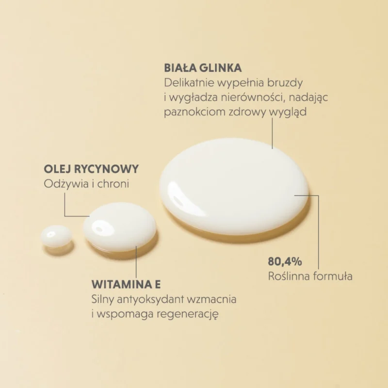 - Biała glinka (Kaolin) – delikatnie wypełnia bruzdy i wygładza nierówności, nadając paznokciom zdrowy wygląd,