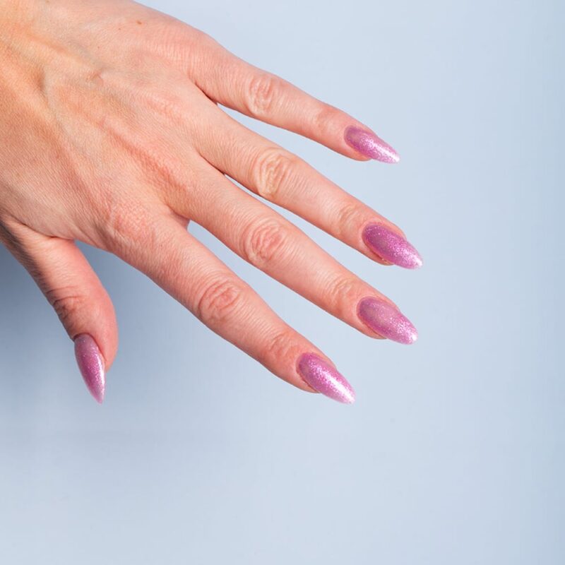 Soczysty róż z dodatkiem różowo-złotej drobinki. Doskonały dla fanek delikatnych rozwiązań w różowych tonacjach.