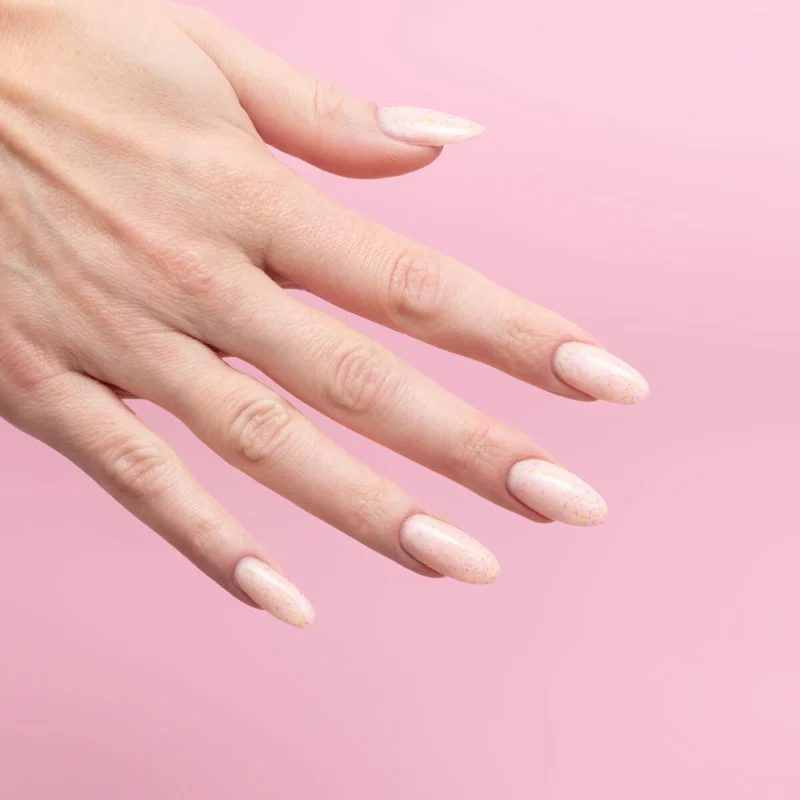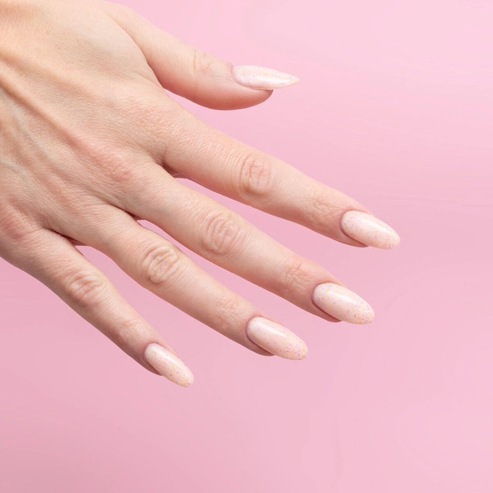 Rozbielony, mleczny kolor masełkowy ze szczyptą słodkiej cytrynki, w którym zatopiliśmy pierwsze wiosenne promienie słońca w postaci neonowo-cukierkowych drobinek w miksie kolorów pomarańcz, fioletu i limonki.