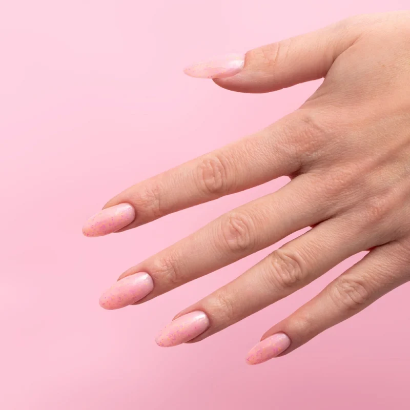 Pastelowy odcień ciepłego różu, w którym zatopiliśmy pierwsze wiosenne promienie słońca w postaci neonowo-cukierkowych drobinek w miksie kolorów słodkiej pomarańczy, fioletu i neonowego różu.