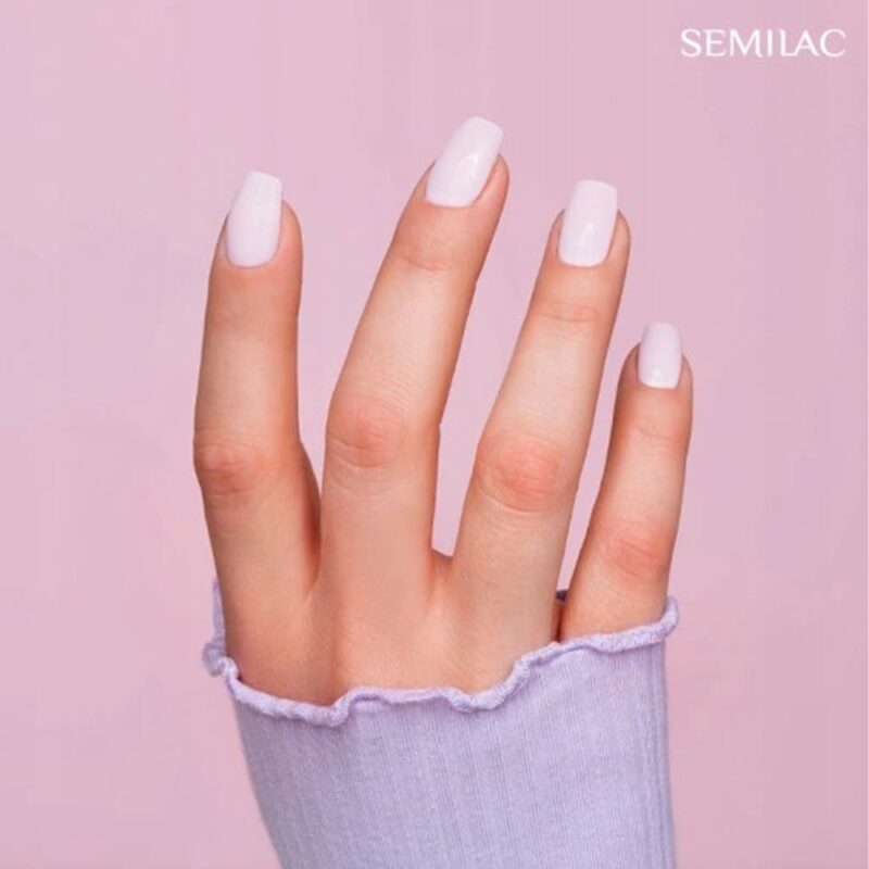 Cienką warstwę Semilac® Color zaaplikuj na utwardzoną warstwę Semilac® Base, a następnie utwardź przy pomocy lampy UV. Nie aplikuj bezpośrednio na płytkę paznokcia. Możesz powtórzyć aplikację Semilac® Color w celu osiągnięcia satysfakcjonującego efektu. Stylizację zakończ nakładając i utwardzając Semilac® Top.