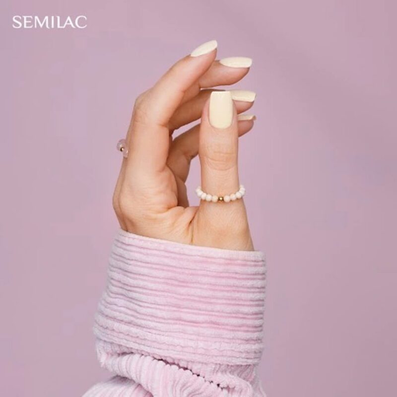 Cienką warstwę Semilac® Color zaaplikuj na utwardzoną warstwę Semilac® Base, a następnie utwardź przy pomocy lampy UV. Nie aplikuj bezpośrednio na płytkę paznokcia. Możesz powtórzyć aplikację Semilac® Color w celu osiągnięcia satysfakcjonującego efektu. Stylizację zakończ nakładając i utwardzając Semilac® Top.