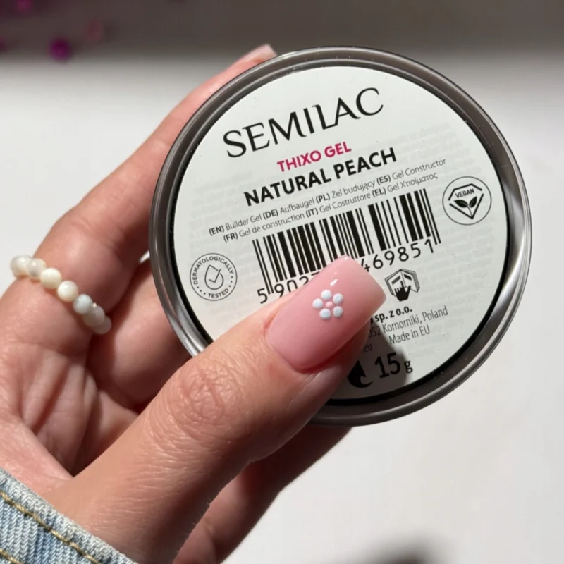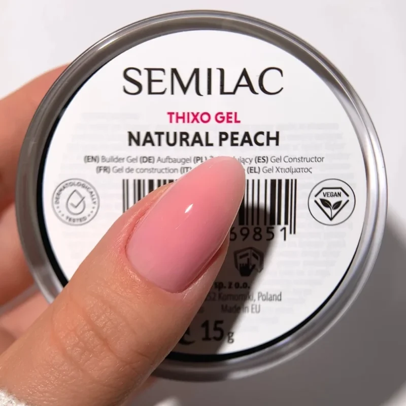 Semilac Żel Budujący Thixo Gel Natural Peach 15 g aplikujemy na właściwie przygotowaną płytkę paznokcia. Rekomendujemy użycie primera. Żel aplikujemy na wcześniej położony żel bazowy Semilac Extend Base. Utwardzamy w lampie UV LED. Jeżeli po aplikacji żelu budującego nie nakładamy kolorowego lakieru hybrydowego stylizację po opracowaniu produktu możemy też zakończyć na tym etapie aplikując na żel produkt wybłyszczający.