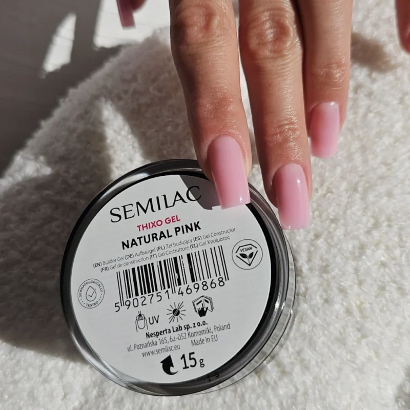 Semilac Żel Budujący Thixo Gel Natural Pink 15 g aplikujemy na właściwie przygotowaną płytkę paznokcia. Rekomendujemy użycie primera. Żel aplikujemy na wcześniej położony żel bazowy Semilac Extend Base. Utwardzamy w lampie UV LED. Jeżeli po aplikacji żelu budującego nie nakładamy kolorowego lakieru hybrydowego stylizację po opracowaniu produktu możemy też zakończyć na tym etapie aplikując na żel produkt wybłyszczający.