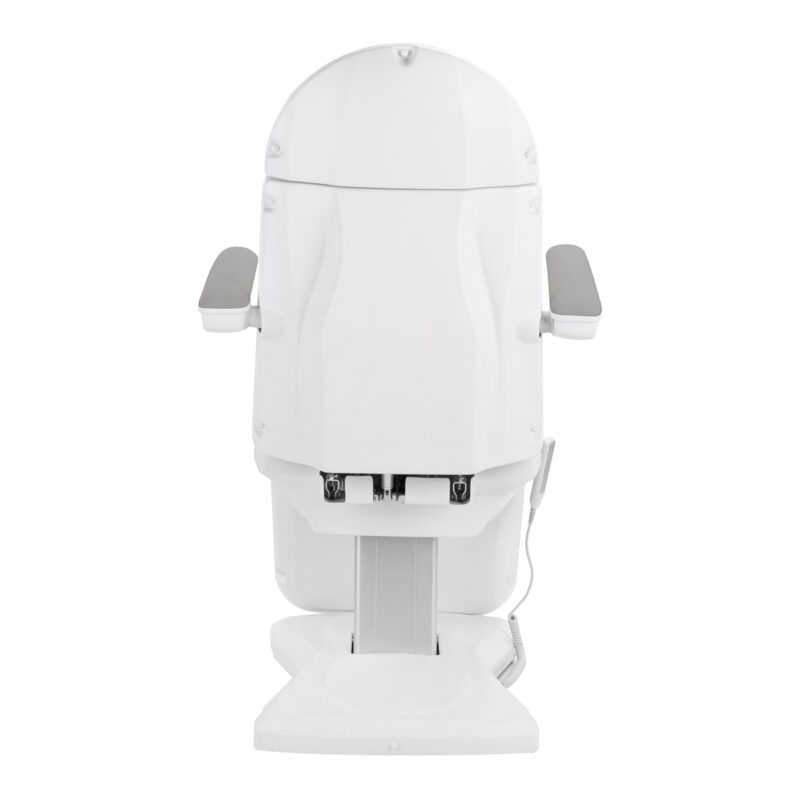 Zagłówek z możliwością wysunięcia o 20 cm pozwala dostosować fotel do wzrostu użytkownika, zapewniając stabilne podparcie głowy podczas zabiegów. Ruchome podłokietniki obracane w zakresie 180° ułatwiają zajmowanie miejsca na siedzisku oraz zapewniają wygodny dostęp osobie wykonującej zabieg. W razie potrzeby można je również łatwo zdemontować. Zastosowane udogodnienia podnoszą komfort użytkowania i wspierają ergonomiczną organizację pracy.