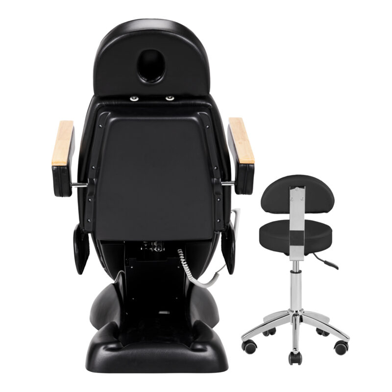 Elektryczny fotel kosmetyczny Sillon Lux 273B wyposażony jest w 3 siłowniki sterowane za pomocą pilota na przewodzie, co pozwala na płynne dostosowywanie go w trzech płaszczyznach – posiada regulację wysokości i kątów nachylenia oparcia oraz podnóżka. Wysokość siedziska regulowana jest w zakresie od 65 cm do 84 cm, a przy całkowitym rozłożeniu fotel osiąga długość ponad 2 metrów. Sprzęt swobodnie można rozłożyć do pozycji leżanki, co w połączeniu z otworem w zagłówku ukrytym pod zaślepką znacząco zwiększa jego funkcjonalność przy usługach na twarz i ciało.