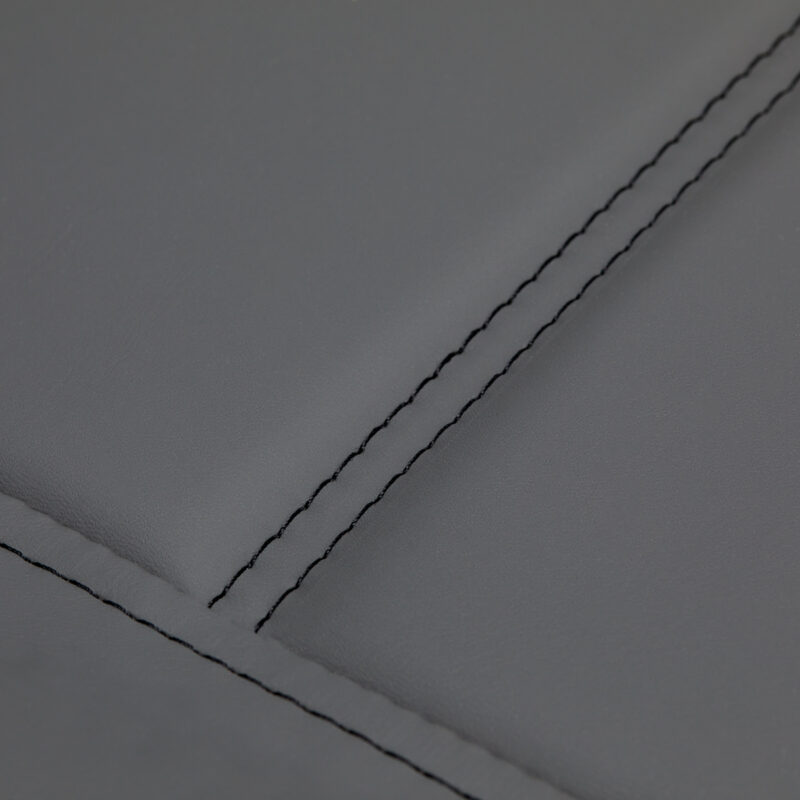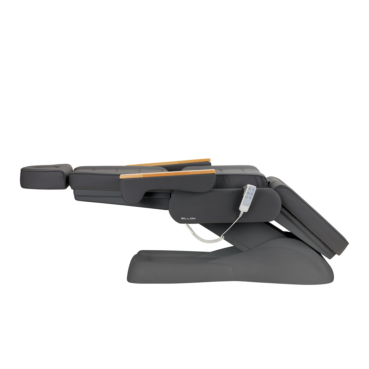 Fotel wypełniony jest pianką o odpowiedniej twardości oraz pokryty przyjemną w dotyku imitacją skóry w odcieniach szarości. Dzięki użyciu materiału, który jest łatwy do utrzymania w czystości oraz odporny na wybrane środki dezynfekcji, sprzęt jest komfortowy w użytkowaniu, wytrzymały na wilgoć oraz nieskomplikowany w czyszczeniu. Solidna podstawa wykonana z trwałego materiału w odcieniach szarości zapewnia stabilność w trakcie zabiegów. Ozdobne drewniane elementy na podłokietnikach wyróżniają fotel pośród innych modeli, stanowiąc atrakcyjny wizualnie, elegancki akcent. Odpowiednio wyprofilowane obszycia nadają fotelowi stylowy wygląd i sprawiają, że siedzisko jest ergonomiczne.