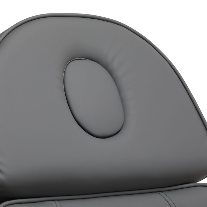 Zagłówek jest wysuwany, co pomaga dostosować sprzęt do potrzeb użytkowników o różnym wzroście, zapewniając stabilne wsparcie głowy w trakcie zabiegów. Ukryty od zaślepką otwór w zagłówku i możliwość swobodnego rozłożenia sprzętu do pozycji leżanki znacząco zwiększa jego funkcjonalność przy usługach na twarz i ciało. Pozwala to na bezproblemowe wykonywanie różnego rodzaju zabiegów, między innymi z zakresu kosmetyki, fizjoterapii czy tatuażu. Zastosowane rozwiązania znacząco poprawiają komfort użytkowania oraz ergonomię pracy.