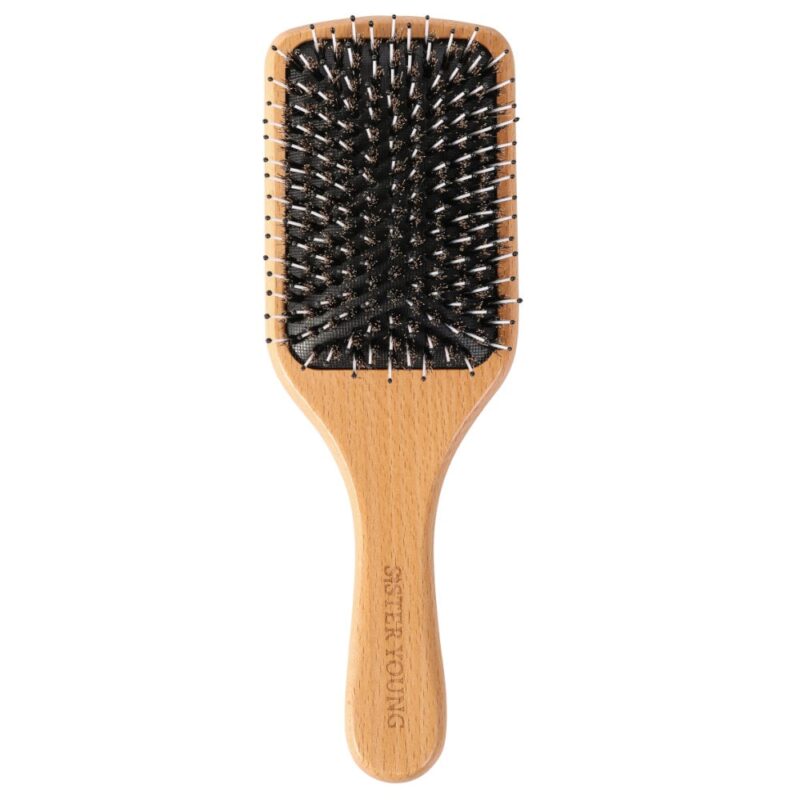 VERA Sister Young Drewniana szczotka wiosłowa typu paddle brush z podwójnym włosiem do rozczesywania, suszenia i prostowania wszystkich rodzajów włosów. Wykonana została z włosia nylonowego oraz naturalnego (włosia dzika). Doskonale wygładza pasma i pozostawia je zdrowe i błyszczące.