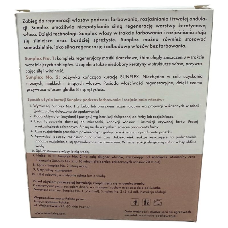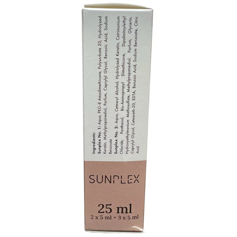 Rewolucyjny zabieg do regeneracji włosów podczas farbowania, rozjaśniania i trwałej stylizacji. Sunplex umożliwia niespotykanie silną regenerację warstwy keratynowej włosa. Dzięki technologii Sunplex włosy w trakcie farbowania i rozjaśniania stają się silniejsze, bardziej sprężyste, odzyskują połysk i nie łamią się. Siłą Sunplexu jest przywrócenie włosom keratyny i odbudowa mostków siarczkowych. Stosowanie Sunplexu nie zaburza procesu farbowania, czy rozjaśniania włosów. Sunplex można używać do klasycznej regeneracji i odbudowy włosów bez farbowania.