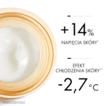 Formuła została zaprojektowana tak, by przeciwdziałać utracie gęstości i wiotczeniu skóry oraz pomóc w modelowaniu owalu twarzy. Już po pierwszej aplikacji krem zapewnia natychmiastowe uczucie chłodzenia (-2,7°C), przynosząc ulgę i komfort.