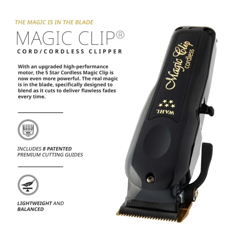Wahl Magic Clip 5 Star Black Cordless to profesjonalna, bezprzewodowa maszynka do włosów wyposażona w wydajny silnik obrotowy 6500 obr./min, opatentowane ostrze Stagger-Tooth™ z powłoką tytanową i DLC oraz technologię Crunch Blade™. Zapewnia precyzyjne cięcie (0,5-1,2 mm), długotrwałą żywotność ostrza i do 100 min pracy na jednym ładowaniu. Idealna do cieniowania, stylizacji i szybkich poprawek w salonie i w domu.